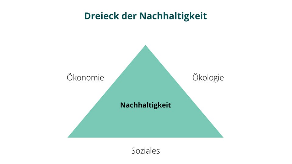 Ein weiteres Modell ist das Dreieck der Nachhaltigkeit. Es ist dem Drei-Säulen-Modell sehr ähnlich und beruht ebenfalls auf den Aspekten Ökologie, Ökonomie und Umwelt.